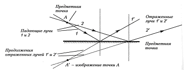 Отраженные лучи 1¢ и 2¢ - расходящиеся, то есть после отражения от зеркала они не пересекаются. Проводим продолжения отраженных лучей. Они пересекаются в точке А¢ за зеркалом. Полученное изображение точки является мнимым.